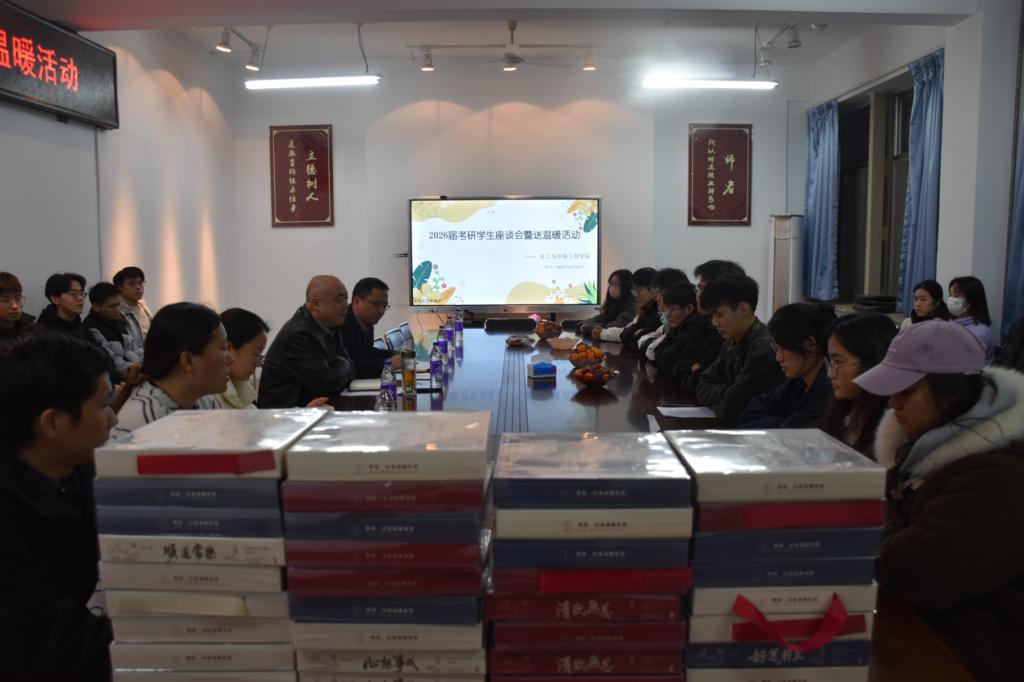 为助力2026届考研学子坚定信念、缓解压力,2025年11月27日晚6时,化工与印染工程学院在506会议室举办了一场温馨的考研茶话会暨送温暖活动。学院党委书记郑汝东、院长王非携教师代表与考研学子齐聚一堂,通过深度互动、暖心祝福等形式,为备考学子注入精神动力。