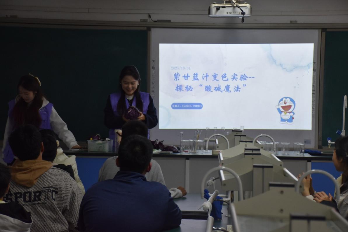 近日,一场以紫甘蓝汁变色实验为核心的 “化学魔法探索课”,在郑州市第五十一中学的实验室顺利开展。本次活动由化工与印染工程学院联合郑州市第五十一中学举办,旨在打破学生对化学 “抽象难学” 的固有认知,通过紫甘蓝汁这一贴近生活的天然原料,直观呈现酸碱反应的奇妙变化,激发学生对化学学科的学习兴趣与探索热情。