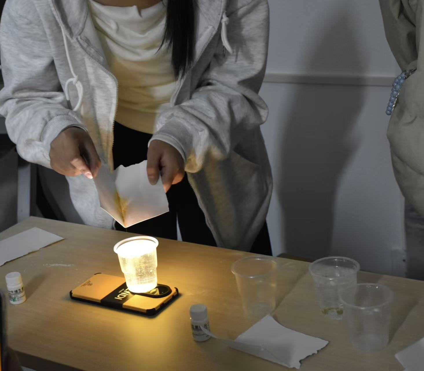 活动现场秩序井然,同学们在工作人员引导下熟悉流程与安全规范后,沉浸式体验三大趣味实验。“跳舞的葡萄干”环节中,放入碳酸饮料的葡萄干随气泡附着沉浮摇摆,让大家直观感知气体浮力;“法老之蛇”实验里,在安全防护下引燃反应物,看着疏松物质逐渐“生长”,深化了对化学反应产物形态变化的认知;黑暗环境中的“荧光流星雨”最为吸睛,粉末倒入清水后荧光缓缓扩散,奇幻效果不仅带来视觉震撼,更拓宽了同学们对特殊化学反应的认知。