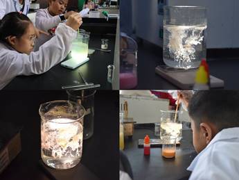活动伊始,学院教工党员向参与者介绍“水母烟花”实验的科学原理及实验安全注意事项,大学生党员化身“实验讲师”,通过实物讲解实验中涉及的溶液反应、密度差异、胶体形成等核心化学知识,让参与者理解“盐水分层+色素扩散”的科学逻辑。讲解结束后,大学生党员分组带领参与者动手实践:参与者先将白色食盐颗粒倒入温水中,用玻璃棒轻轻搅拌,再倒入纯净水中完成分层准备;再用滴管将混有色素的牛奶轻滴入盐水中——只见色素在液体中缓缓舒展、晕染开“伞状纹路”,宛如水中绽放的“烟花水母”,现场瞬间被此起彼伏的惊叹声和欢呼声淹没。参与者们还尝试调整色素滴入的角度和速度,观察不同形态的“水母纹路”,在趣味操作中解锁了科学实验的乐趣。