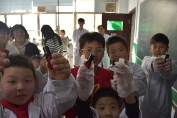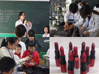 讲解结束后,中小学生分组开启“口红DIY”体验环节:从模具、容器和口红壳消毒,到将杏仁油、色粉和蜂蜡加热融化,再到香料与天然防腐剂维生素E进行滴加,最后装到模具低温定型。在大学生志愿者的一对一指导下,中小学生逐步将基础的“天然化学原料”转化为精美的“专属口红”。当口红从模具中缓缓取出,现场响起阵阵惊喜的赞叹声,大家纷纷表示“原来化学实验可以这么有趣!”